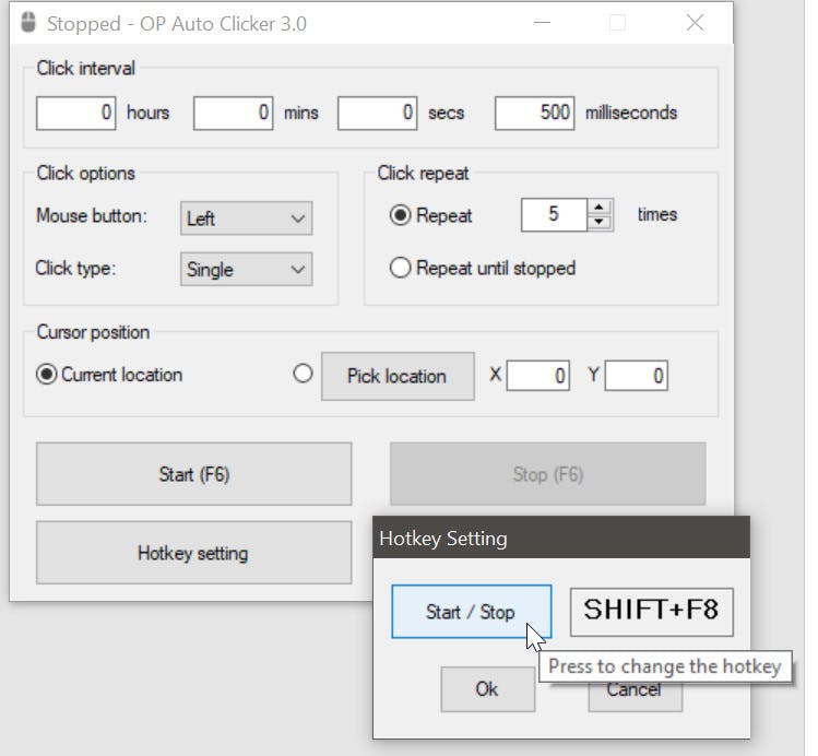Zó eenvoudig is Auto Clicker dus in het gebruik. Je kunt met slechts één ding in de knel raken en dat is de sneltoets waarmee je Auto Clicker bedient. Die sneltoets kan namelijk conflicteren met een sneltoets van het programma dat je op dat moment bedient. Gelukkig is dat op te lossen met behulp van de optie Hotkey setting, want daarmee kun je iedere sneltoets-combinatie instellen die je maar wenselijk acht.