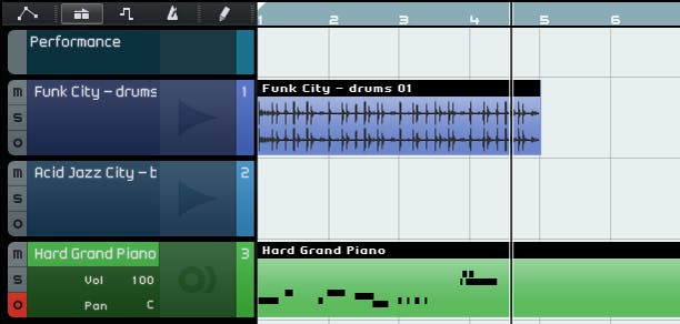 Een midi-spoor wordt aangegeven door een groene kleur. In de loop ziet u ook geen golfvorm, maar een grafische weergave van de noten die u hebt ingespeeld.
