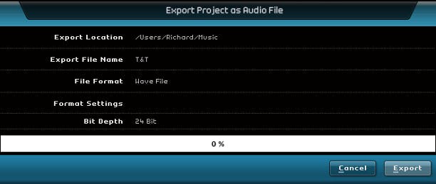 Als u helemaal tevreden bent met uw muziektrack, dan gaat u naar Project / Save As. Geef het project een naam en klik op OK. Wilt u het project exporteren als audiobestand, dan hebt u twee keuzes. Ga naar Project / Export Project as Audio File en geef achter Export Location aan waar u het bestand wilt opslaan. De bestandsnaam geeft u aan achter Export File Name. De Bit Depth is standaard ingesteld op de professionele standaard van 24 Bit, maar dat kunt u veranderen in 16 Bit om er zeker van te zijn dat u het audiobestand ook kunt afspelen op bijvoorbeeld een iPod. Klik op Export om uw track te exporteren. U kunt de track ook direct naar iTunes exporteren. Hiervoor klikt u op Project / Export Project to iTunes, waarna uw track automatisch aan iTunes wordt toegevoegd.