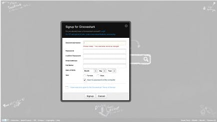 Om muziek te luisteren met Grooveshark is het hebben van een gebruikersaccount dus geen verplichting. Wilt u echter overal dezelfde afspeellijsten en favorieten of wilt u gebruikmaken van de sociale functies of de VIP-mogelijkheden, dan is het wel nodig om een account aan te maken. Klik in het hoofdscherm op Create an account en voer uw gegevens in de velden in. Bevestiging via e-mail is niet nodig, uw e-mailadres wordt enkel achter de hand gehouden voor als u uw wachtwoord een keer vergeet. Na het aanmaken van een account kunt u direct inloggen.