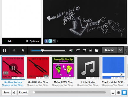 U kunt uw afspeellijst of nummer op verschillende manieren delen met anderen. Door met de rechtermuisknop op een afspeellijst of lied te klikken krijgt u een menu met drie opties voor delen: Share Song, Share on Twitter en Share on Facebook. U kunt ook een mediaspelertje met uw afspeellijst op uw eigen website zetten. Speel muziek af en klik onderaan op de knop Export. U kunt nu uw eigen mediaspeler ontwerpen, waarbij u zelf formaat, kleur, thema enzovoort instelt. In de laatste stap van het proces ziet u een code waarmee u de widget insluit op uw website.
