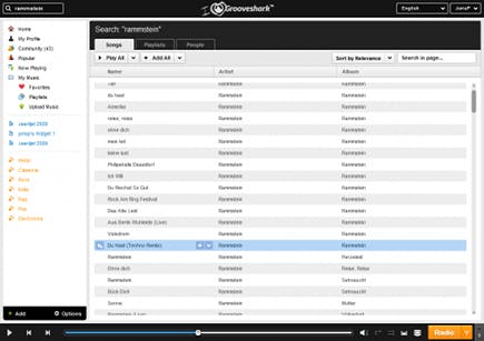 De zoekresultaten van Grooveshark worden lang niet zo overzichtelijk getoond als die van Spotify. Pluspunt van Grooveshark is echter dat er meer artiesten te vinden zijn. Spotify mist bijvoorbeeld onder andere (veel van) Red Hot Chili Peppers, Rammstein, Metallica, AC/DC, Tool, Pink Floyd, Led Zeppelin en Arcade Fire. Toch niet de minste namen. The Beatles is trouwens via geen van beide diensten te beluisteren.