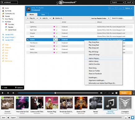 In Grooveshark leiden bijna altijd meerdere wegen naar Rome, waardoor iedereen snel met de dienst overweg kan. Hebt u een nummer uitgekozen om te beluisteren, dan hebt u vier manieren om dit af te spelen: door te dubbelklikken op de titel van het nummer, door op het 'play'-pijltje voor het nummer klikken, door in het rechtermuisknopmenu kiezen voor Play song now (of Play song next) of door te klikken en te slepen naar de 'albumstrip' onder in beeld. Die strip wordt door Grooveshark de 'Current Song Viewer' genoemd.
