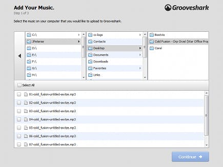 Groovesharks bibliotheek is zo groot omdat gebruikers hun eigen muziek kunnen uploaden. Ook u kunt dat doen. Let hierbij wel op: het uploaden van muziek waar u de rechten niet van bezit is illegaal in Nederland. Het is wel ideaal om zelfgemaakte muziek aan iedereen laten horen. Klik links op Upload Music, er opent een nieuw venster, waarin u middels een Java-applicatie in drie stappen bestanden selecteert, muziekgegevens invoert en muziek uploadt. De upload-applicatie geeft alleen de audioformaten weer die toegevoegd kunnen worden.