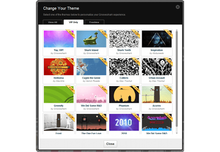 Het standaardthema van Grooveshark is een krijtbord, waar u met krijtletters op weg wordt geholpen de functies te verkennen. Handig, maar als u Grooveshark vaker gebruikt, verveelt het snel. Door op de beginpagina rechtsonder op Themes te klikken verschijnen de keuzemogelijkheden. Als niet betalende gebruiker zijn de opties beperkt tot een vijftal simpele achtergrondjes en een paar gesponsorde thema's van vooral bands en merken. VIP's (betalende gebruikers) hebben meer keuze tot een paar beter vormgegeven thema's.