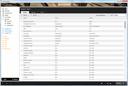 U kunt zoeken binnen de getoonde zoekresultaten met het zoekvak rechtsboven. Klikt u binnen de zoekresultaten op een artiest of albumnaam, dan krijgt u muziek van die specifieke artiest of dat specifieke album. In het overzicht van een artiest zijn ook de beschikbare albums te zien. Het tabblad Similar geeft vergelijkbare artiesten weer; een handige functie om nieuwe muziek te ontdekken. Wanneer u op de pagina van een Grooveshark-gebruiker zit, kunt ook zien naar welke afspeellijsten of muziek hij/zij graag luistert onder de desbetreffende tabbladen.
