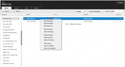 Ieder nummer kunt u markeren als favoriet. Dit kan door op het lied te klikken met de rechtermuisknop en Add to Favorites te selecteren, maar ook door in de strip op het plusje en daarna op het hartje te klikken. De functie Favorites in het linkermenu geeft alle favorieten weer. U kunt ook direct vanuit de zoekresultaten nummers aan uw favorieten toevoegen door op het plusje en hartje te klikken. Bent u liefhebber van andermans afspeellijst, dan drukt u (nadat u de lijst hebt opgezocht) op Subscribe. De afspeellijst wordt vervolgens in het linkermenu weergegeven.