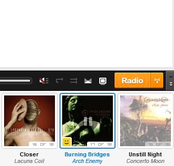 Zoals iedere mediaspeler, bevat ook Grooveshark afspeelfuncties. Vlak boven de strip vindt u knoppen voor onder andere afspelen en pauzeren, navigeren naar het volgende en vorige nummer, herhalen (Repeat), enzovoort. Gaat u met uw muis over de tijdbalk, dan ziet u extra eigenschappen en opties met betrekking tot het afspelende nummer. Uiterst rechts naast de Radio-knop zit een knop om de strip te verbergen en weer terug te halen. Functioneel wanneer u lange lijsten met zoekresultaten op uw scherm tovert.