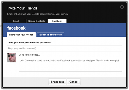 U kunt ook vrienden uitnodigen om Grooveshark te gaan gebruiken. Als u een mailadres invoert van iemand die Grooveshark al gebruikt, dan volgt u deze persoon direct. De andere gebruiker krijgt een melding dat u fan van hem/haar bent. Voert u een mailadres in van iemand die nog geen Grooveshark gebruikt, dan krijgt hij of zij een uitnodiging om aan de slag te gaan met Grooveshark. Ook kunt u kijken of uw Google- of Face-book-contacten actief zijn op Grooveshark zijn door uw gebruikersnaam en wachtwoord in te geven. Deze mogelijkheden staan onder Settings / Invite Friends.