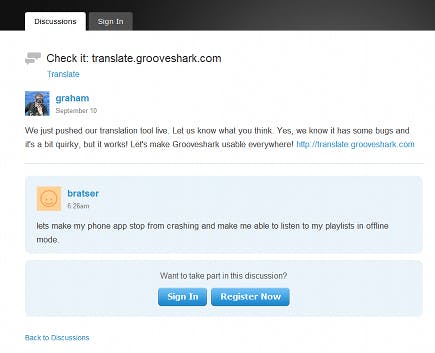 Als u tegen problemen aanloopt of juist anderen wilt helpen, heeft Grooveshark ook een forum. Op dit forum kunt u ook lezen over de ontwikkelingen en bugs die momenteel te vinden zijn in Grooveshark. Ook is het forum een verzamelplaats voor proactieve gebruikers die graag hun steentje willen bijdragen om Grooveshark beschikbaar te maken in een andere taal. Ook Nederlanders zetten zich hiervoor in. Het forum is te bereiken via Forums.Gooveshark. Als u zelf een probleem ondervindt kunt u de hulpwebsite bezoeken.