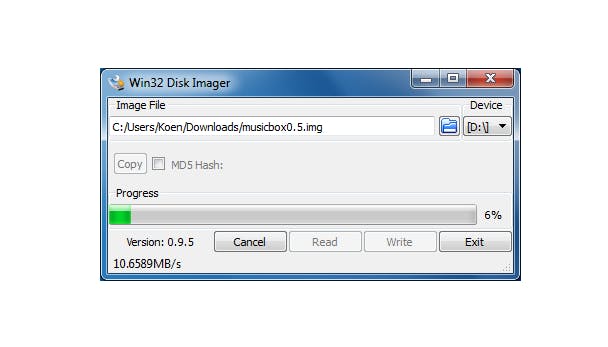 Download het image van Pi MusicBox, halverwege de pagina staat een link onder het kopje Installation. Op het moment van schrijven was het versie 0.5. Pak het zip-bestand uit, waarna je een img-bestand en de handleiding ziet. Het img-bestand is 960 MB groot en past op een SD-kaartje van 1 GB. Steek het SD-kaartje in de kaartlezer van je computer. Download het programma Win32 Disk Imager en start het. Geef bij Device de schijfletter van je SD-kaart op en klik op het mapicoontje om het image-bestand te selecteren. Klik onderaan op Write om het image naar de SD-kaart te schrijven.