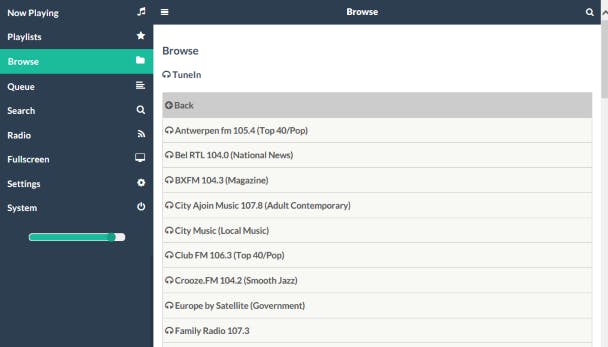 Via deze webinterface bestuur je nu Pi MusicBox vanaf je pc, smartphone of tablet. Internetradiozenders en podcasts kun je al onmiddellijk beluisteren. Klik daarvoor links op Browse, en dan op TuneIn of Dirble voor internetradio of op Podcasts als je een podcast wilt beluisteren. Daaronder vind je nog allerlei categorieën, bijvoorbeeld voor muziekgenres of onderwerpen. Klik op een radiostation of aflevering van een podcast om hem op je MusicBox af te spelen. Klik op Back om terug naar de vorige map te gaan.
