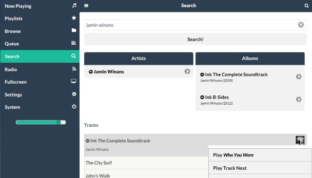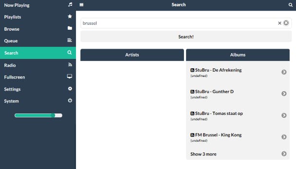 De zoekfunctie van Pi MusicBox wordt nog handiger als je je Spotify-account hebt toegevoegd. Je kunt hiermee immers in de hele collectie van Spotify zoeken. De resultaten krijg je mooi per artiest en per album te zien. De nummers kun je weer onmiddellijk afspelen of aan je wachtrij toevoegen. Als je op een artiest of album klikt, krijg je de nummers van die artiest of op dat album op een afzonderlijke pagina te zien. Zo speel je heel snel willekeurige songs van Spotify af op je Raspberry Pi.