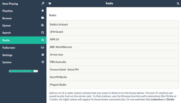 Als je favoriete radiostation niet in de lijst staat, voeg je die eenvoudig toe. Klik links op Radio. In de twee tekstvelden boven het knopje Play / Save vul je achtereenvolgens de url van de playlist van het radiostation in en de naam. Druk daarna op Play / Save om je radiostation op te slaan en af te spelen. De laatste 25 internetradio's die je toevoegt worden overigens op deze pagina bijgehouden. Helaas wordt dat in een browsercookie opgeslagen. Voeg je op je smartphone een radiostation toe, dan kun je die niet vanaf je pc opstarten.