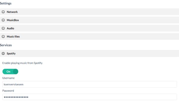 Nu moet je de gegevens van je Spotify-account nog invullen in Pi MusicBox. Klik daarvoor links in de webinterface van Pi MusicBox op Settings en onder Services op Spotify. Schakel daar de Spotify-ondersteuning in en vul je gebruikersnaam en wachtwoord in. Eventueel kies je een lagere bitrate als je niet te veel bandbreedte wilt verbruiken tijdens het streamen van muziek. Klik tot slot onderaan de pagina op Update settings. Je Raspberry Pi zal nu herstarten en als alles goed gaat na de herstart toegang hebben tot Spotify.