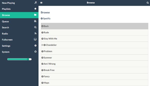 Als je vervolgens naar het menu Browse gaat, zie je dat er een onderdeel Spotify toegevoegd is. Klik je erop, dan krijg je mappen te zien met je persoonlijke topnummers, wereldwijde topnummers en topnummers per land. Daaruit speel je eenvoudig nummers door erop te klikken. Klik je daarna bovenaan links op Now Playing, dan krijg je een afbeelding van het liedje te zien en een voortgangsindicator.