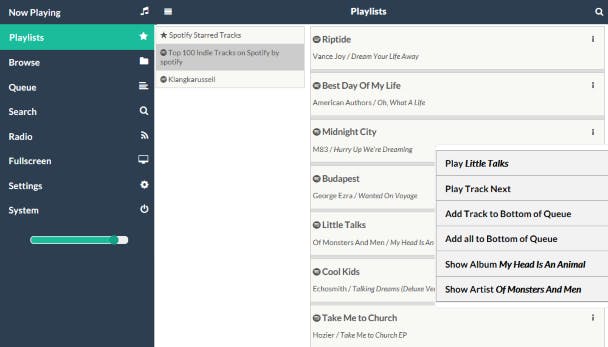 Als je in Spotify afspeellijsten hebt aangemaakt of je op afspeellijsten van anderen hebt geabonneerd, zijn die ook in Pi MusicBox beschikbaar. Klik daarvoor linksboven op Playlists en kies dan je afspeellijst. Rechts krijg je dan alle nummers te zien. Klik je eenvoudigweg op een nummer, dan wordt het afgespeeld. Je hebt nog meer opties als je rechts bij een nummer op de drie vierkantjes klikt. Je kunt het nummer aan je wachtrij toevoegen achter het huidige liedje, onderaan de wachtrij toevoegen of alle liedjes uit deze afspeellijst onderaan je wachtrij toevoegen.
