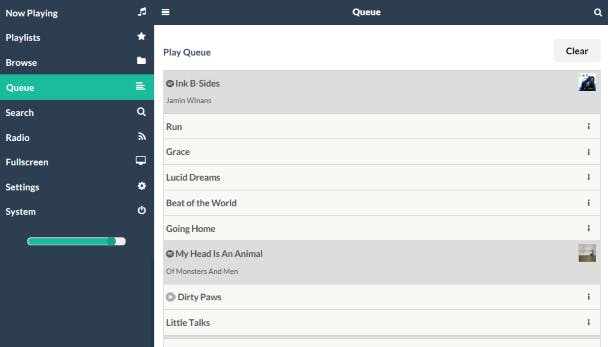 De wachtrij krijg je te zien als je links op Queue klikt. Wil je de huidige wachtrij leeg maken, klik dan bovenaan rechts op Clear. Wil je een nummer uit de wachtrij verwijderen, klik dan op de drie vierkantjes rechts en dan op Remove from Queue. Helaas is de wachtrij nog vrij rudimentair: wanneer een lied in de rij staat, kun je de volgorde van afspelen niet veranderen. Je kunt een nummer wel afspelen voordat deze aan de beurt is door erop te klikken. Daarna gaat je wachtrij gewoon verder na dat liedje.