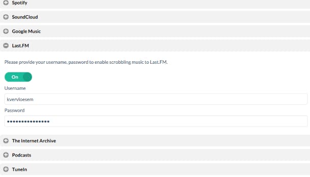 Wil je dat alle nummers die je op je Pi-muzieksysteem afspeelt aan je Last.fm-lijst worden toegevoegd, geef dan in de instellingen van Pi MusicBox je Last.fm-account in. Klik daarvoor op Last.FM, schakel de ondersteuning met het schuifknopje in en vul je gebruikersnaam en wachtwoord in. Klik helemaal onderaan op Update settings en wacht tot je Pi herstart is. Daarna wordt je Last.fm-lijst op de achtergrond continu bijgewerkt met de muziek die je op MusicBox afspeelt en vind je de tracks in je lijst met scrobbles.