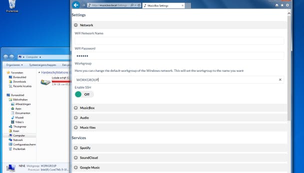 Een andere interessante bron van muziek om op je Pi-muzieksysteem af te spelen is natuurlijk de muziek op je eigen lokale netwerk. Heb je een uitgebreide muziekcollectie op je computer staan, dan kun je die ook via MusicBox afspelen. Je deelt eenvoudigweg je muziekmap op je Windows-pc met de rest van je netwerk. Daarna klik je in de instellingen van Pi MusicBox op Network en wijzig je indien nodig de standaardnaam van de werkgroep (WORKGROUP) naar die van jouw netwerk. In Windows 7 en 8 krijg je de werkgroepnaam te zien als je op Windows-toets+Pause drukt.