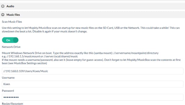 Pi MusicBox kan ook muziekbestanden van zijn SD-kaart lezen. We raden dat niet echt aan, omdat een SD-kaart slechts een kleine capaciteit heeft en niet zo'n betrouwbaar opslagmedium is. Maar het is mogelijk. Ga daarvoor eerst in de instellingen van Pi MusicBox naar Music files en schakel Resize filesystem in. Het image van Pi MusicBox dat je op je SD-kaartje geschreven hebt maakt immers niet gebruik van de volledige capaciteit van je SD-kaartje. Herstart en sleep de bestanden naar je MusicBox, die in het Windows-netwerk zichtbaar is. Schakel Scan Music Files in en herstart nog een keer.