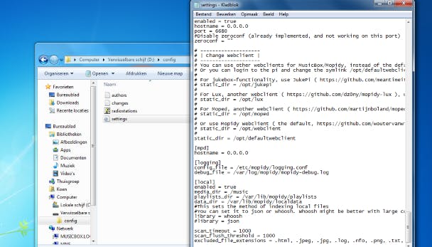 Heb je in de instellingen iets zo hard verknoeid dat je er niet meer in slaagt om via de webinterface van Pi MusicBox de schade te herstellen, dan is er nog een uitweg. Schakel je Pi uit, haal het SD-kaartje eruit en steek die in de kaartlezer van je computer. Zodra Windows je de inhoud van het SD-kaartje toont, open je de map config. Open daarin het bestand settings.ini met Kladblok. Alle regels die met een # beginnen zijn commentaar: uitleg over de bijbehorende instellingen. Pas de nodige zaken aan, steek het SD-kaartje terug in je Pi en start die op.