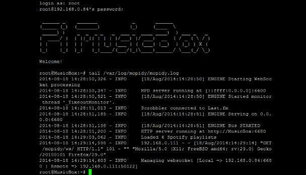 Wil je wat meer onder de motorkap kijken, schakel dan in de instellingen van Pi MusicBox Enable SSH in. Na een klik op Update settings en een herstart van je Pi kun je nu inloggen via PuTTY, zoals je misschien gewend bent van vorige workshops over de Raspberry Pi. Vul als gebruikersnaam root in en als wachtwoord musicbox. Toegang via PuTTY is handig bij problemen: zo kun je de inhoud van de logbestanden bekijken om foutmeldingen op te sporen.