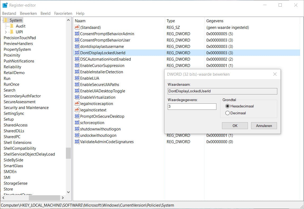 Als je ook je echte naam wilt verbergen, is het nodig om de register-editor erbij te pakken. Je opent regedit door daarop te zoeken in het menu Start. Blader nu naar de sleutel HKEY_LOCAL_MACHINE\SOFTWARE\Microsoft\Windows\CurrentVersion\Policies\System en zoek naar de optie DontDisplayLockedUserId. Zet die waarde op 3 om je volledige naam, avatar en e-mailadres te verbergen als de computer vergrendeld is. Doe hetzelfde bij de waarde dontdisplaylastusername, om ervoor te zorgen dat na het opstarten je volledige naam en e-mailadres niet zomaar in beeld komen. Bij het aanmelden moet je dan zelf je e-mailadres intypen.