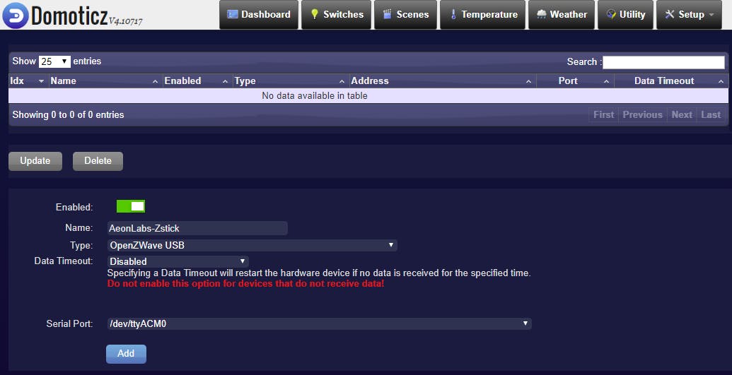 Steek de Z-Wave-stick in een vrije usb-poort. Gebruik bij voorkeur een usb-verlengkabel, je kunt de stick dan naast de nas leggen en voorkomt dat je de nas of de stick beschadigt wanneer je deze verplaatst. Een goede plek voor de Z-Wave-stick komt de kwaliteit van de communicatie ten goede. Heb je de stick geplaatst, start dan Domoticz op de nas en selecteer onder Setup / Hardware het OpenZwave USB-device. Geef deze een naam en klik op Add.