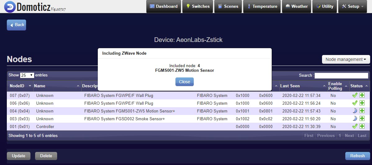 Nu Domoticz op de nas klaar is voor communicatie via het Z-Wave-protocol is het tijd de Z-Wave-hardware toe te voegen. Pak het Z-Wave-apparaat dat je wilt toevoegen en controleer in de handleiding hoe je deze activeert om opgenomen te worden in een controller. Schakel die stand in en klik dan in Domoticz rechtsboven op Node Management en selecteer Include Node. Even later zal het Z-Wave-apparaat worden gevonden en toegevoegd. Herhaal dit voor eventuele extra apparaten die je aan de Domoticz-installatie wilt toevoegen.
