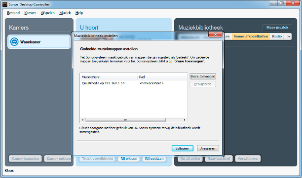 Hebt u zo'n mooi muzieksysteem van Sonos, dan hoeft u niet direct ook een betaald abonnement op een streaming muziekdienst als Spotify te nemen. Met een Sonos kunt u ook prima muziek afspelen die op uw NAS staat in een gedeelde map. Start de Sonos Desktop Controller en ga naar Muziek / Muziekbibliotheek instellen. Klik op Share toevoegen / Muziek toevoegen die is opgeslagen in gedeelde mappen in mijn netwerk. Typ het pad naar de map en de gebruikersnaam en wachtwoord. Daarna wordt de map toegevoegd aan de bibliotheek.