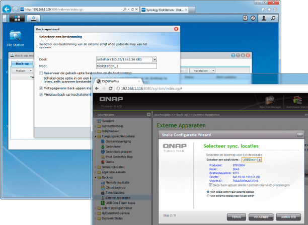 De meeste functies van een NAS kunnen tijdens het gebruik worden aangepast. Een uitzondering daarop is de schijfindeling. Wilt u bijvoorbeeld van RAID1 naar JBOD, dan gaat alle informatie op de NAS verloren. Maak daarom voordat u dit doet, een back-up van de NAS op een externe schijf en liefst ook nog een keer naar een pc of andere NAS in het netwerk. Heeft de NAS eSATA of usb 3.0 dan gebruikt u die, dat is een stuk sneller dan usb 2.0. Usb 3.0 heeft een blauwe connector op de NAS, usb 2.0 een zwarte.