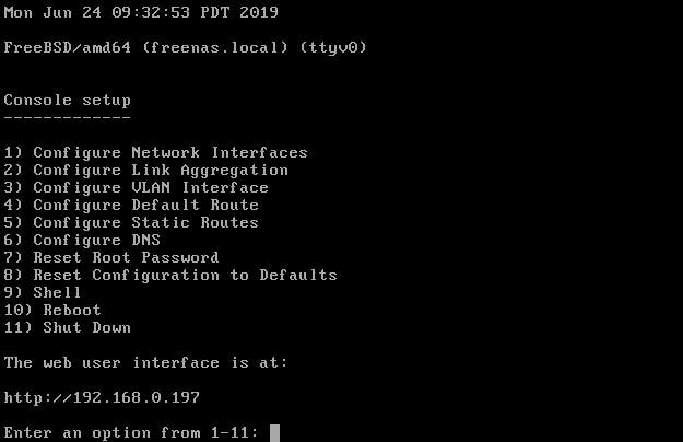 Als het goed is, start je systeem inderdaad op van de installatie-stick en verschijnt even later een keuzemenu. Druk op Enter om de bovenste optie Boot FreeNAS Installer te selecteren. Vervolgens kies je 1 Install/Upgrade. Beschikt je systeem over minder dan 8 GB ram, dan verschijnt hier een melding over. Deze kun je wegklikken met Yes. Een belangrijk moment nu: met de pijltjestoetsen navigeer je naar de schijf (of de stick) waarop je FreeNAS zelf wilt installeren – dus niet de schijf waar je je data wenst te bewaren. Bevestig je keuze met de spatietoets (er verschijnt een asterisk naast die optie) en druk op OK en op Yes. Vul een stevig wachtwoord in voor de FreeNAS-beheerder (2x) en bevestig met OK. Afhankelijk van je systeem (raadpleeg desnoods je systeemhandleiding) kies je vervolgens voor Boot via UEFI of Boot via BIOS. Wacht geduldig af tot de installatie is voltooid. Op het einde van de rit druk je op OK en kies je 3 Reboot System. Zorg wel dat het installatiemedium is verwijderd. In het nieuwe startmenu kies je dan 1. Boot FreeNAS. Na wat gegoochel door FreeBSD verschijnt een keuzemenu. Je hoeft hier niets mee te doen: we gaan de bediening overnemen via het netwerk!