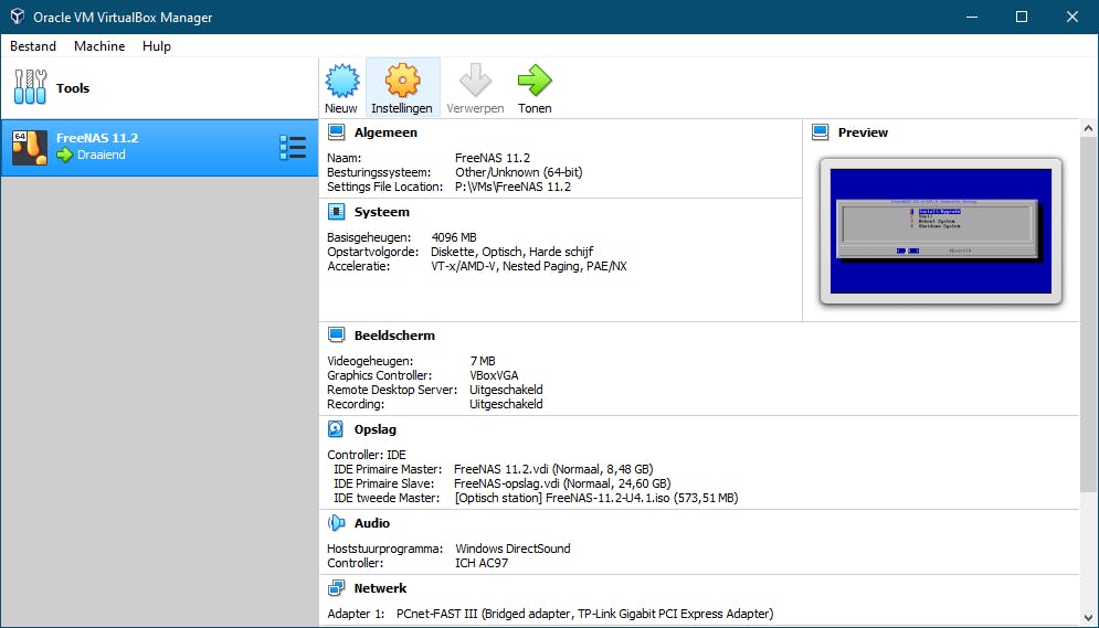 Wil je eerst gewoon wat experimenteren met FreeNAS, dan kun je een virtuele installatie overwegen, bijvoorbeeld met het gratis Oracle VM VirtualBox. Download en installeer de tool. In het beheervenster klik je op Nieuw. Vul FreeNAS in als naam en kies Other bij Type en Other/Unknown (64-bit) bij Versie. Druk op Volgende en kies bij voorkeur 8 GB geheugen. Druk op Volgende, laat Maak nieuwe virtuele harde schijf nu aan aangestipt en bevestig met Aanmaken. Selecteer de optie VDI, druk op Volgende (2x) en stel de grootte in op minimaal 8 GB. Bevestig met Aanmaken. Selecteer je FreeNAS en klik op Instellingen. Ga naar Opslag, kies Leeg en klik op het cd-pictogram. Hier selecteer je Kies een virtuele optische schijfbestand en verwijs je naar het FreeNAS iso-bestand. Vervolgens klik je op Controller:IDE en op het plusknopje Voegt harde schijf toe. Selecteer Maak een nieuwe schijf aan en geef een locatie, naam en een gepaste grootte (voor het bewaren van je data-opslag) op. Rond af met Aanmaken. Ga nu naar Netwerk en selecteer bij Gekoppeld aan de optie Netwerk bridge adapter, zodat je straks ook vanaf je andere pc’s bij de virtuele FreeNAS-machine kunt. Druk op OK en op de pijlknop bij Starten: de installatie kan beginnen (zie artikel). Let op: aan het einde van de installatie, net voor de FreeNAS-herstart, moet je bij Netwerk rechtsklikken op het iso-bestand en Verwijderen aansluiting kiezen.