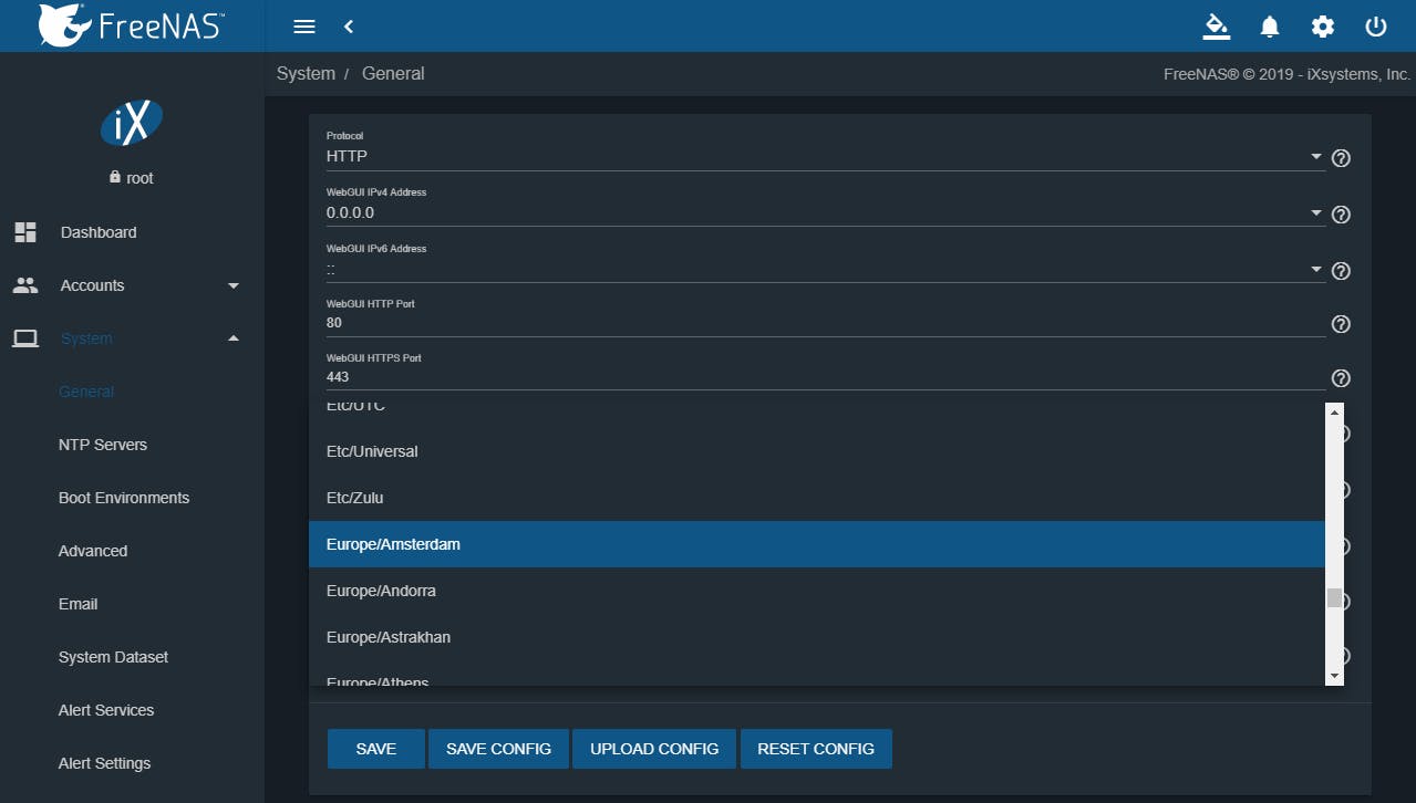 De bedoeling is nu dat je vanuit een webbrowser op een pc in hetzelfde netwerk afstemt op het ip-adres van je FreeNAS-machine. Het ip-adres lees je af net onder het FreeNAS-menu. Zodra je http://<ip-adres> intikt, verschijnt het inlogvenster van FreeNAS. Vul de gebruikersnaam (‘root’) en het eerder opgegeven wachtwoord in, en klik op LOG IN. Het is zover: het grafische dashboard van de FreeNAS-beheermodule duikt op. Tijd voor een eerste configuratie. Je merkt dat de standaardtaal Engels is en dat is wellicht de betere keuze, omdat de meeste handleidingen, community’s en instructievideo’s van die taal uitgaan. Mocht je toch liever voor Nederlands kiezen, open dan de rubriek System, kies General en stel Language in op Dutch. Vergeet hier hoe dan ook niet de Timezone in te stellen op Europe/Amsterdam. Bevestig met Save, plaats een vinkje bij Confirm en druk op Continue. FreeNAS herstart even later met de gevraagde aanpassingen. Althans, dat is het idee. Op ons testsysteem weigerde FreeNAS de Nederlandstalige interface te tonen (Frans bijvoorbeeld lukte wel).