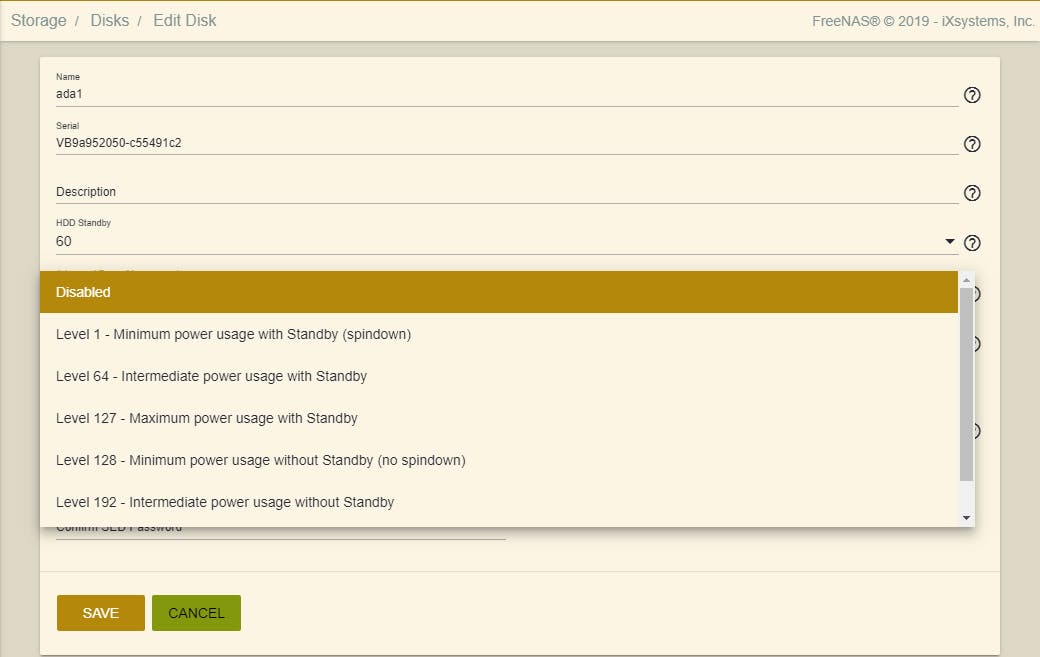 Toegegeven, een nadeel van zo’n nas op een afgedankte pc of laptop is dat het stroomverbruik merkbaar hoger ligt dan bij een specifiek nas-apparaat. Wel kun je ervoor zorgen dat de schijf na een tijd automatisch op stand-by gaat. Open de rubriek Storage in FreeNAS en kies Disks. Plaats een vinkje bij de schijf die je voor je dataopslag gebruikt en klik op Edit disk(s). Wijzig de standaardwaarde Always on bij HDD Standby in bijvoorbeeld 60 (minuten van inactiviteit waarna de schijf in stand-by gaat). Je kunt ook een zuinig energiebeheer instellen: klik op het pijltje bij Advanced Power Management en kies bijvoorbeeld Level 1 – Minimum power usage with Standby. Houd er rekening mee dat het een paar seconden kan duren voor de schijf uit deze slaapstand komt.