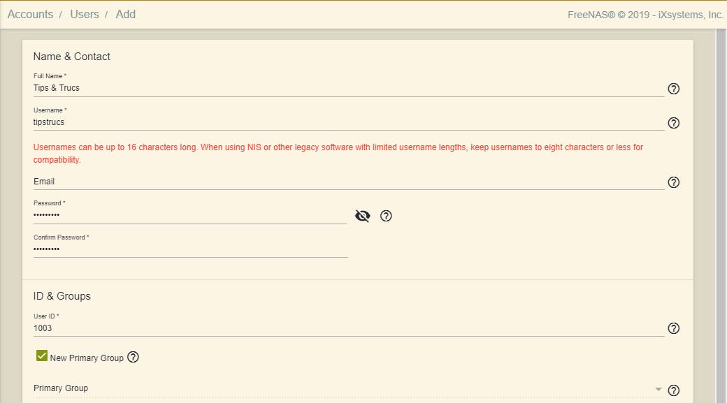 Voor we de rechten op onze pool gaan instellen, creëren we nu eerst een gebruiker in FreeNAS en zullen we die vervolgens de nodige rechten toekennen om de pool te benaderen. Open de rubriek Accounts en kies Users. Druk op de knop Add en vul zowel de volledige naam als de gebruikersnaam in. Dat mag eventueel dezelfde zijn – gebruik bij Username wel kleine letters. Stel ook een wachtwoord in (2x). Eventueel gebruik je dezelfde gebruikersnaam en wachtwoord als die van een Windows-account op het toestel van waaruit je naderhand de share wilt benaderen – dat maakt het authentiseren iets makkelijker. Helemaal rechtsonder plaats je een vinkje bij Microsoft Account. De andere opties kun je ongemoeid laten. Bevestig met Save: de gebruiker wordt toegevoegd.