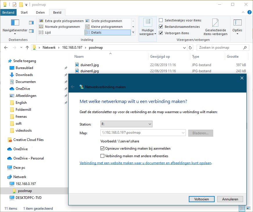 Je krijgt nu de zonet aangemaakte share te zien. Die kun je openen en je kunt er bestanden en mappen creëren, wijzigen en verwijderen. Als je deze map vaker wilt benaderen, raden we aan om hiervoor een permanente netwerkverbinding te creëren. Om dit te doen, rechtsklik je in het navigatievenster van de Verkenner op de naam van de share, onderaan bij Netwerk, en kies je Netwerkverbinding maken. Kies een vrije stationsletter, controleer of het pad correct is ingesteld (bijvoorbeeld \\192.168.0.197\poolmap), laat het vinkje staan bij Opnieuw verbinding maken bij aanmelden en bevestig met Voltooien. Voortaan laat deze share zich via de ingestelde stationsletter bereiken op dat toestel. Uiteraard kun je deze handelingen ook op je andere Windows-clients herhalen.
