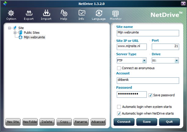 Nadat u NetDrive geïnstalleerd hebt voegt u met de knop New site de schijfruimte van een webdienst als een gewone Windows-schijf toe aan uw systeem. De website moet wel het ftp- of het WebDav-protocol ondersteunen. Geef bijvoorbeeld de gegevens op van een ftpaccount van uw internetprovider of een eigen domein, en u kunt voortaan zonder speciaal ftp-programma uw complete website beheren. Gewoon vanuit uw verkenner. Een pictogram nestelt zich in het systeemvak, zodat u makkelijk naar het configuratie- en het instellingenscherm kunt springen.