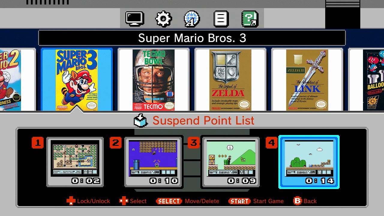 Zodra je de Classic Mini NES inschakelt, kom je in een eenvoudig configuratiemenu terecht. Na het activeren van de Nederlandse taal kun je direct aan de slag. Je hebt keuze uit dertig voorgeïnstalleerde spellen, waaronder bekende namen als Donkey Kong, The Legend Of Zelda en Pacman. Daar moet je het overigens wel mee doen, want in tegenstelling tot de originele NES kun je geen cartridges vervangen. Een verbetering is dat deze heruitgave de voortgang van games tussentijds opslaat. Je hoeft een game dus niet eerst volledig uit te spelen voordat je het apparaat uitschakelt.
