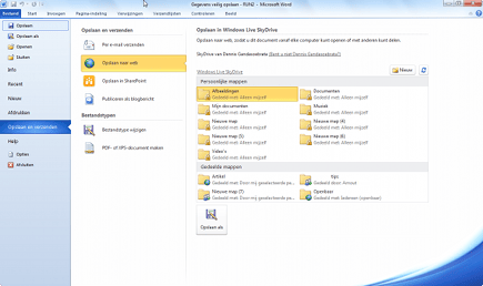 Maakt u gebruik van Office 2010? Deze nieuwste Office-versie kent een nauwe integratie met SkyDrive. In de praktijk betekent dit dat u bestanden direct vanuit Office op uw SkyDrive-account kunt opslaan. Hebt u bijvoorbeeld uw administratie bijgewerkt in Excel, dan slaat u de bijgewerkte Excel-sheet direct online op. In elk Office-programma kiest u voor Bestand, Opslaan en verzenden, Opslaan naar web. Klik vervolgens rechts in het venster op de knop Aanmelden, zodat u zich voor de dienst kunt aanmelden. Nadat u dat hebt gedaan, verschijnt een overzicht van beschikbare mappen. U kunt nu ook nog zelf een nieuwe map aanmaken. Klik vervolgens op Opslaan als om het bestand online op te slaan.