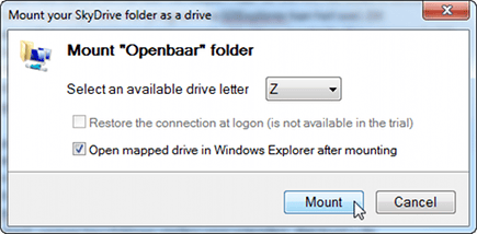 Bevalt de functionaliteit u, dan kunt u de betaalde versie van SDExplorer aanschaffen. Deze biedt een aantal aardige extra's. U kunt via de Windows Verkenner de rechten van uw back-upmappen aanpassen. Wilt u de map bijvoorbeeld tijdelijk openstellen voor andere personen? Klik met de rechtermuisknop op de map waarvan u de rechten wilt aanpassen en kies voor Delen met, Vrienden of vrienden van vrienden. U kunt de rechten weer beperken via Delen met, Alleen mijzelf. Daarnaast kunt u via de Windows Verkenner per SkyDrive-map aangeven voor welk type inhoud deze is bedoeld. Klik met de rechtermuisknop op de map en kies Maptype wijzigen. Hierna kiest u tussen Documenten, Favorieten en Foto's. De belangrijkste extra optie ten opzichte van de kosteloze versie is de mogelijkheid om uw SkyDrive-account te voorzien van een schijfletter. Zo is deze gemakkelijk toegankelijk via andere programma's. Klik met de rechtermuisknop op de map die u een eigen schijfletter wilt geven en kies Netwerkverbinding maken. Selecteer de schijfletter en plaats een vinkje bij Restore the connection at logon. Ook activeert u de optie Open mapped drive in Windows Explorer after mounting. Hierna heeft de map een eigen letter. Handig!