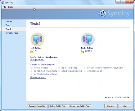 Het is verstandig om te controleren of uw back-upinstellingen kloppen voordat u de synchronisatie daadwerkelijk uitvoert. Alleen dan weet u op voorhand of de gekozen back-upinstelling de juiste is. SycToy heeft hiervoor de functie Preview in huis. Deze geeft overzichtelijk weer welke bestanden en mappen worden gekopieerd, hernoemd of verwijderd. In het hoofdvenster van SyncToy kiest u de synchronisatie die u wilt controleren, waarna u klikt op Preview. Controleer na afloop de instellingen. Tevreden? Klik op Run om de back-up daadwerkelijk uit te voeren. In het hoofdvenster van SyncToy kunt u de synchronisatie altijd uitvoeren met een klik op de knop Run.