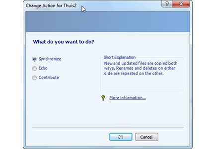 SyncToy biedt drie manieren waarop mappen met elkaar kunnen worden gesynchroniseerd: Synchronize, Echo en Contribute. De eerste optie - Synchronize - zorgt ervoor dat nieuwe en gewijzigde items in beide mappen worden bijgewerkt: er vindt dus een identieke synchronisatie plaats. De tweede optie - Echo - zorgt ervoor dat nieuwe en gewijzigde items in beide mappen worden bijgewerkt. Zodra er items een andere naam hebben gekregen of zijn verwijderd, worden de aanpassingen alleen doorgevoerd van de linker- naar de rechtermap. De derde en laatste optie - Contribute - zorgt ervoor dat gewijzigde items van de linker- naar de rechtermap worden gekopieerd. Als een item in de linkermap een andere naam heeft gekregen, wordt dit in de rechtermap overgenomen. Als er een bestand of map is verwijderd, gebeurt er niets. Er worden dus nooit items weggegooid.