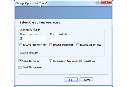 Een eerder ingestelde synchronisatie kunt u achteraf aanpassen. In het hoofdvenster selecteert u de synchronisatie die u wilt aanpassen. Wilt u de actie - Synchronize, Echo of Contribute - veranderen, klik dan op Change action. Wilt u geavanceerde instellingen aanpassen, dan kiest u voor Change options. In het vak Inclusion/Exclusion kunt u aangeven of u specifieke bestanden wilt opnemen of juist uitsluiten. Wilt u bijvoorbeeld niet dat tijdelijke tmp-bestanden worden gesynchroniseerd, dan typt u *.tmp in het vak Files to exclude. Daarnaast kunt u alleen-lezen bestanden uitsluiten (Exclude read-only files), verborgen bestanden uitsluiten (Exclude hidden files) en systeembestanden uitsluiten (Exclude system files). Om een submap binnen een synchronisatie uit te sluiten, kiest u voor Select subfolder. Onderin het instellingenvenster vindt u nog een interessante optie: Check file contents. Dit is een extra zekerheidsinstelling, waarmee alle gekopieerde bestanden en mappen op bitniveau met elkaar worden vergeleken. Zo is SyncToy er zeker van dat alle gekopieerde bestanden identiek aan elkaar zijn. Het inschakelen van de optie zorgt er wel voor dat het synchroniseren meer tijd in beslag neemt.