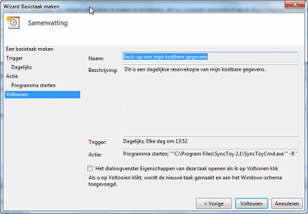 Gebruikt u Windows Vista of Windows 7, dan kunt u SyncToy als volgt automatiseren. Klik op Start en open de Taakplanner: typ Taken plannen en druk op Enter. In het nieuw geopende venster kiest u voor Basistaak maken. Geef vervolgens zowel een naam als beschrijving voor de taak op. Geef vervolgens aan hoe vaak de back-up moet worden gemaakt. Het is verstandig hier te kiezen voor Dagelijks. Bevestig met een klik op Volgende. Hierna geef u aan wanneer u de reservekopie wilt maken. Kies hier een tijdstip waarop u de computer niet of nauwelijks gebruikt. Kies hierna voor Een programma starten. In het vak Programma/script typt u het volgende: "X:\Program Files\SyncToy 2.1\SyncToyCmd.exe". Vervang X door de schijfletter van het station waarop SyncToy zich bevindt. In de meeste gevallen is dit de C:\-schijf. Bij Parameters toevoegen typt u -R "Profielnaam". Voor Profielnaam typt u de exacte naam in van het mappaar dat u wilt synchroniseren. Controleer de naam van het mappaar goed en klik op Volgende. De wizard is bijna ten einde. Controleer of de gegevens kloppen en klik op Voltooien om de taak op te slaan.