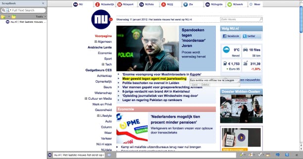 U hebt geen internetverbinding nodig om websites te lezen. Met de add-on ScrapBook voor Firefox kunt u gemakkelijk bezochte websites opslaan en later offline lezen. Als u nog geen Firefox hebt, gaat u naar Mozilla.org en klikt u op de groene knop Get Firefox. U komt op een nieuwe pagina waar u opnieuw op de groene knop (Firefox) moet klikken. Volg de aanwijzingen op het scherm en start Firefox op. In Firefox gaat u naar deze link en klikt u op Toevoegen aan Firefox. In het pop-up-scherm klikt u op Nu Installeren en in het schermpje linksboven klikt u vervolgens op Nu herstarten. Firefox wordt opnieuw opgestart en in het menu van Firefox vindt u nu de optie ScrapBook. Hebt u de menubalk niet standaard ingeschakeld, klik dan met de rechtermuisknop naast een tabblad en kies voor Menubalk. Helemaal rechts ziet u vervolgens het icoontje van ScrapBook. Als u nu bijvoorbeeld de website nu.nl bezoekt en op ScrapBook / Save Page drukt, wordt de pagina opgeslagen op uw computer. Denk eraan dat alleen de actieve pagina wordt opgeslagen, alle nieuwsberichten van nu.nl zijn dus nog niet naar uw computer gedownload. U kunt niet alleen websites offline lezen, zelfs het toevoegen van tekstjes en het markeren van tekst is een fluitje van een cent.