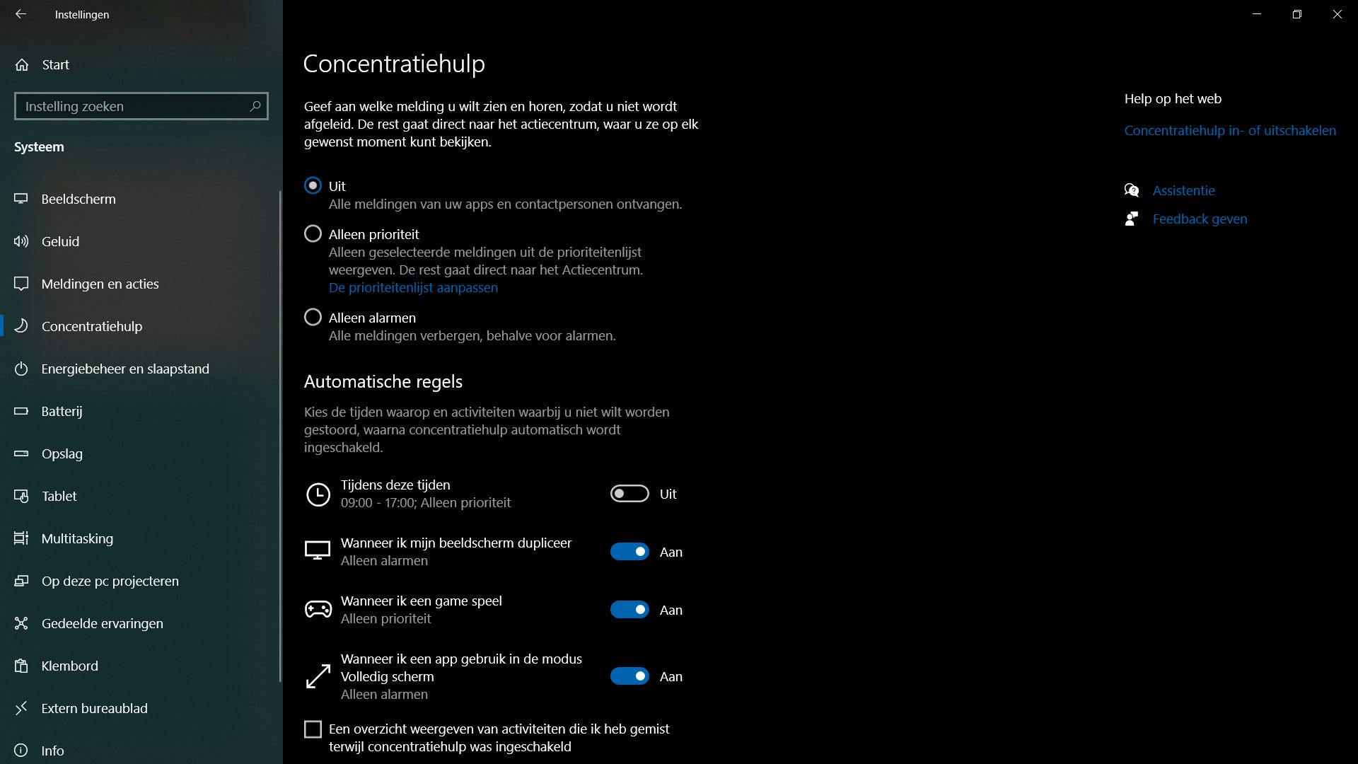 Zo kan het zijn dat je de concentratiehulp van Windows aan hebt staan. Dan ontvang je van geen enkele app meer een notificatie. Open de Instellingen, ga naar Systeem en druk op Concentratiehulp. Selecteer de optie Uit en check of je nu weer notificaties krijgt.