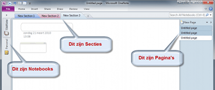 OneNote organiseert informatie in Notebooks, Secties en Pagina's.