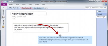 Een kladblok staat niet alleen vol met informatie, maar vaak ook met strepen en pijlen die aangeven welke informatie eigenlijk ergens anders moet staan. Het herschikken van gegevens is erg belangrijk en schept behalve ordening vaak ook weer nieuwe gegevens. OneNote heeft alle flexibiliteit in huis die u hierbij wenst en u kunt ieder onderdeel op een pagina verplaatsen. Zet de muis boven het betreffende onderdeel, zodat direct het vak zichtbaar wordt waar de informatie zich binnen bevindt. Met de muis kunt u het vak verslepen door op de grijze balk bovenaan het vak te klikken en de muis vervolgens te verslepen.